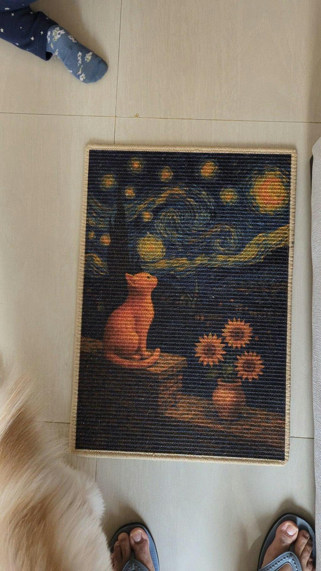 I am in absolutely love with the design. While our cat 'Casper' took a liking to the mat within 2 days, I think I like the mat more than him. The Van gogh inspired design with cats in it is such a clever idea. would buy mor if they get mor van gogh designs. Quality is very sturdy too.